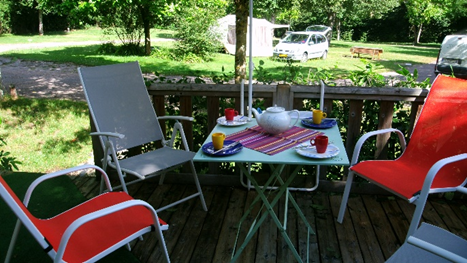 Mobile home heeft een compleet ingerichte keuken, een badkamer, apart toilet en een privéterras met tuinmeubels.